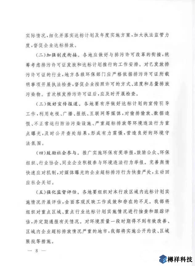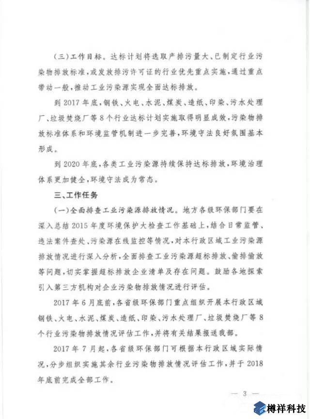環境保護部日前發布《關于實施工業污染源全面達標排放計劃的通知》(以下簡稱《通知》),要求到2017年底,鋼鐵、火電、水泥、煤炭、造紙、印染、污水處理廠、垃圾焚燒廠等8個行業達標計劃實施取得明顯成效,污染物排放標準體系和環境監管機制進一步完善,環境守法良好氛圍基本形成。到2020年底,各類工業污染源持續保持達標排放,環境治理體系更加健全,環境守法成為常態。