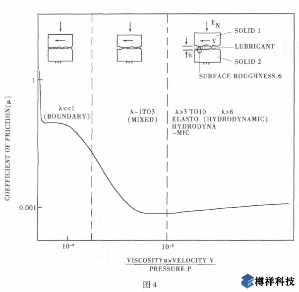 如前所述,Streibeck 曲線的建立是以滑動軸承為基礎的,其橫坐標采用滑動軸承特性數(shù)Zn/p 是很合理的選擇(其意義與Sommerfield 數(shù)ηω/p 相同)。但是隨著摩擦學的發(fā)展,研究對象日益豐富和多樣化,僅用這個參數(shù)來表示摩擦副表面間的隔離程度是具有局限性的。美***的Hamrock 教授提出, 為使Streibeck 曲線更具普遍性,將橫坐標改為油膜厚度與表面粗糙度之比(比膜厚Specific Film Thickness)λ。
