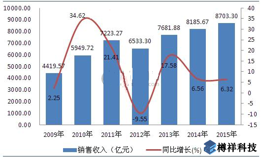 2009-2015年我***儀器儀表制造行業(yè)銷售收入變化情況(單位:億元,%)